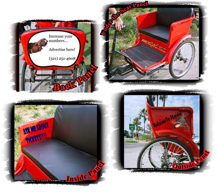 THE ADVERTISEMENT IS ON US!Redi Pedi Cab Company offers advertising on virtually every part of the Redi Pedi Cab. You can also advertise on our driver's business cards. You can even advertise on our drivers. We can be customized to fit your needs. Contact